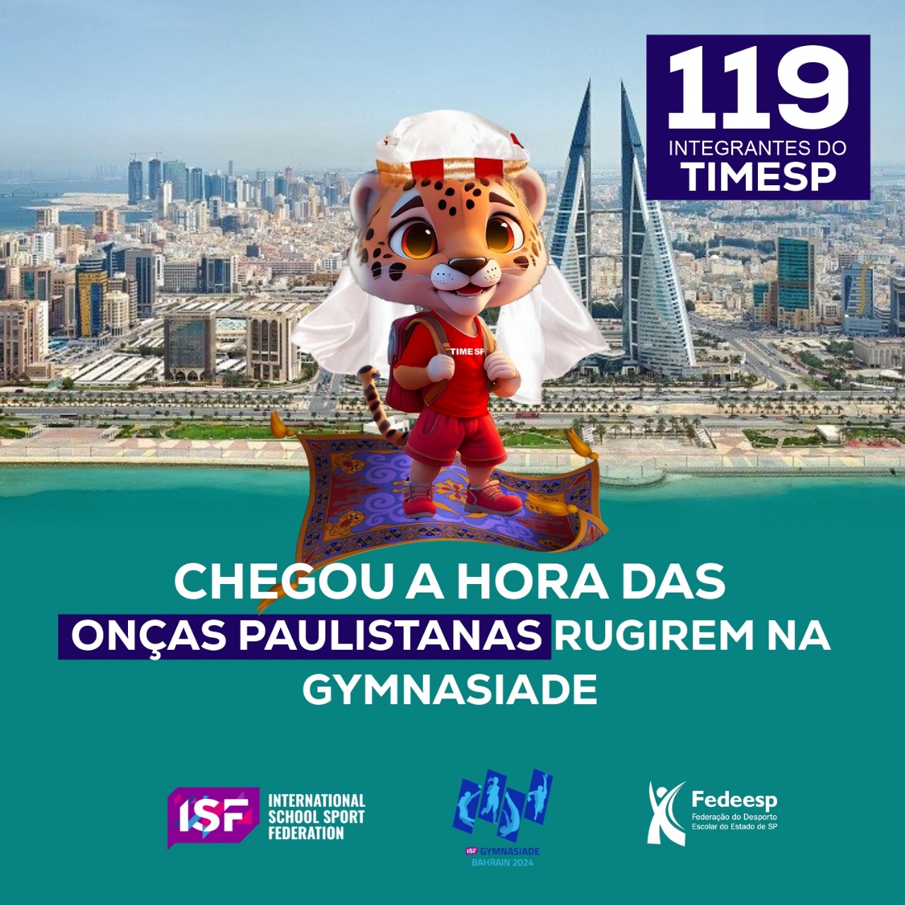 Com uma delegação de 119 integrantes, sendo atletas, técnicos e dirigentes, o TIMESP, as nossas onças paulistanas, se destaca como a maior equipe do Brasil na Gymnasiade Sub-18 confirmando a potência do estado na formação de jovens atletas. A Confederação Brasileira do Desporto Escolar (CBDE) anunciou nesta sexta-feira (11/10) os 405 nomes que representarão o Brasil na Gymnasiade Sub-18, no Bahrein, entre os dias 23 e 31 de outubro.