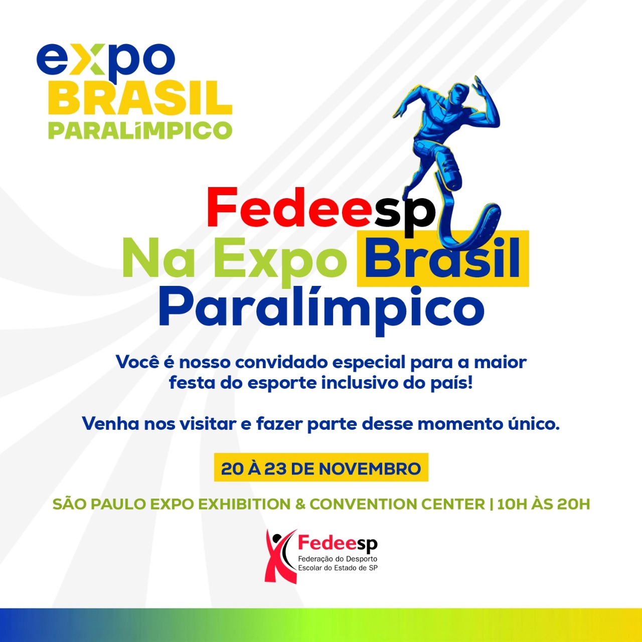 A Federação do Desporto Escolar do Estado de São Paulo (Fedeesp) convida a todos para visitar seu stand na Expo Brasil Paralímpico, que acontecerá entre os dias 20 e 23 de novembro, das 10h às 20h, no São Paulo Expo Exhibition & Convention Center em São Paulo.